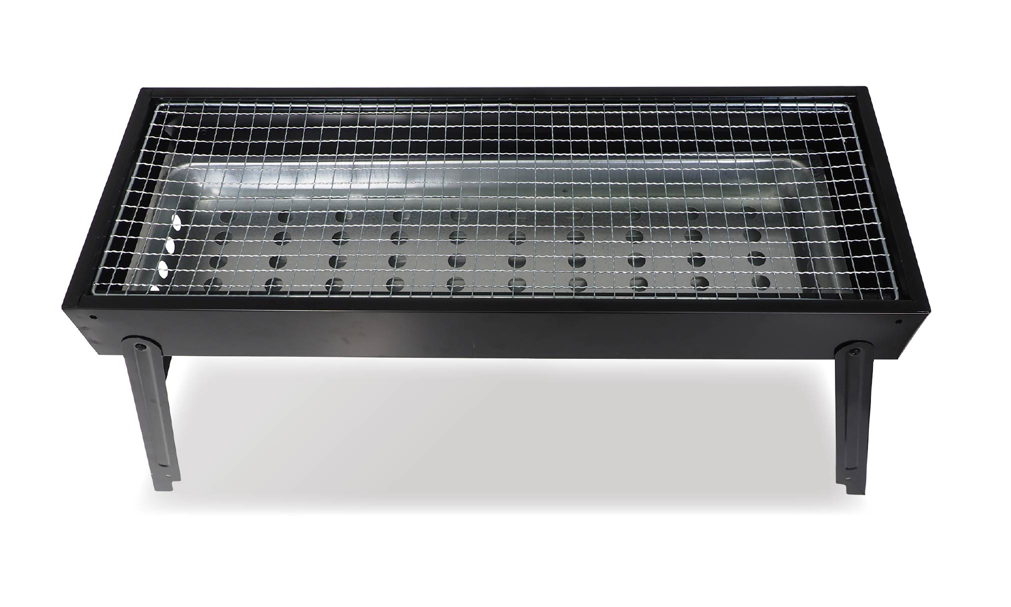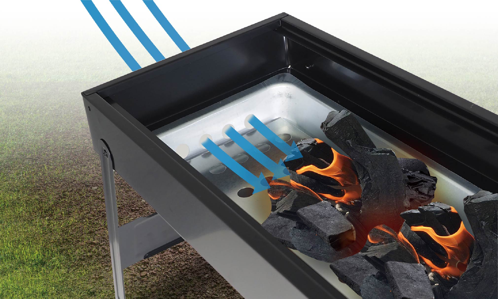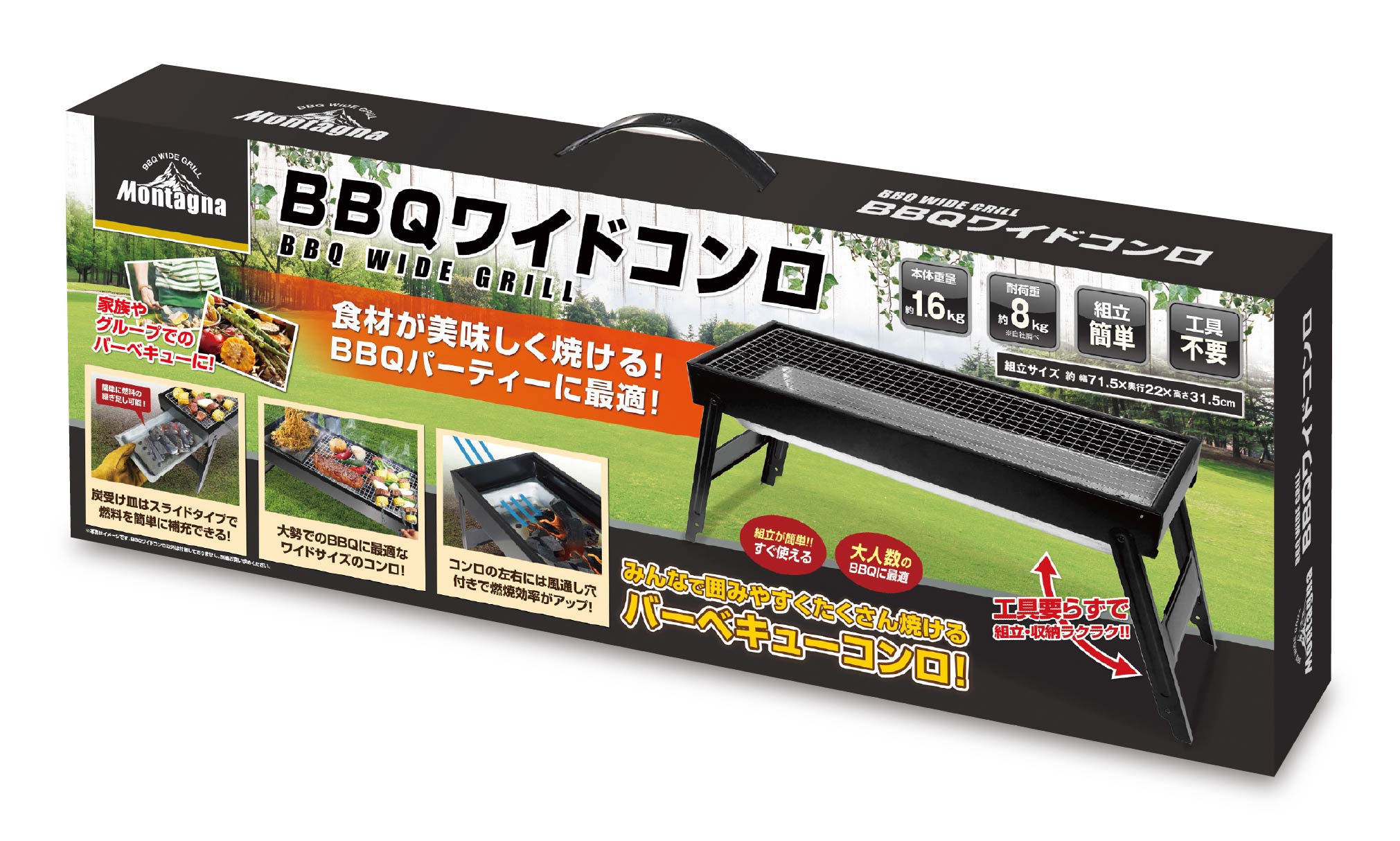 工具要らずで簡単に組み立て可能なBBQワイドコンロ。焼網面がワイドなので、焼き鳥やお肉などを並べて一気に焼き上げます。炭受け皿はスライド式で燃料の補充も簡単に。コンロの左右面には風通し穴が空いていて、燃焼効率を高めたコンロ設計です。底面プレート付きで使用後の掃除も楽々便利なアイテムです。