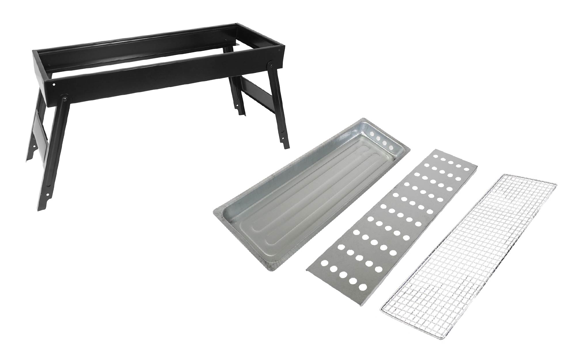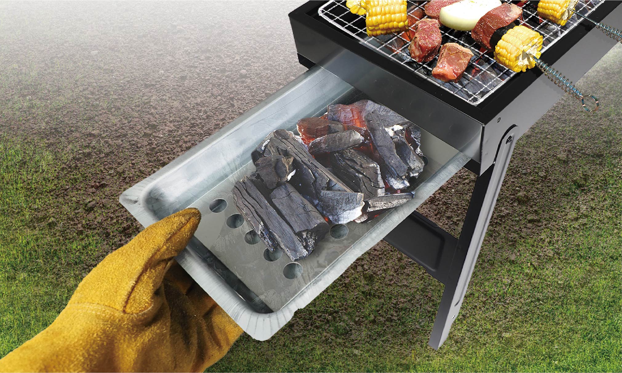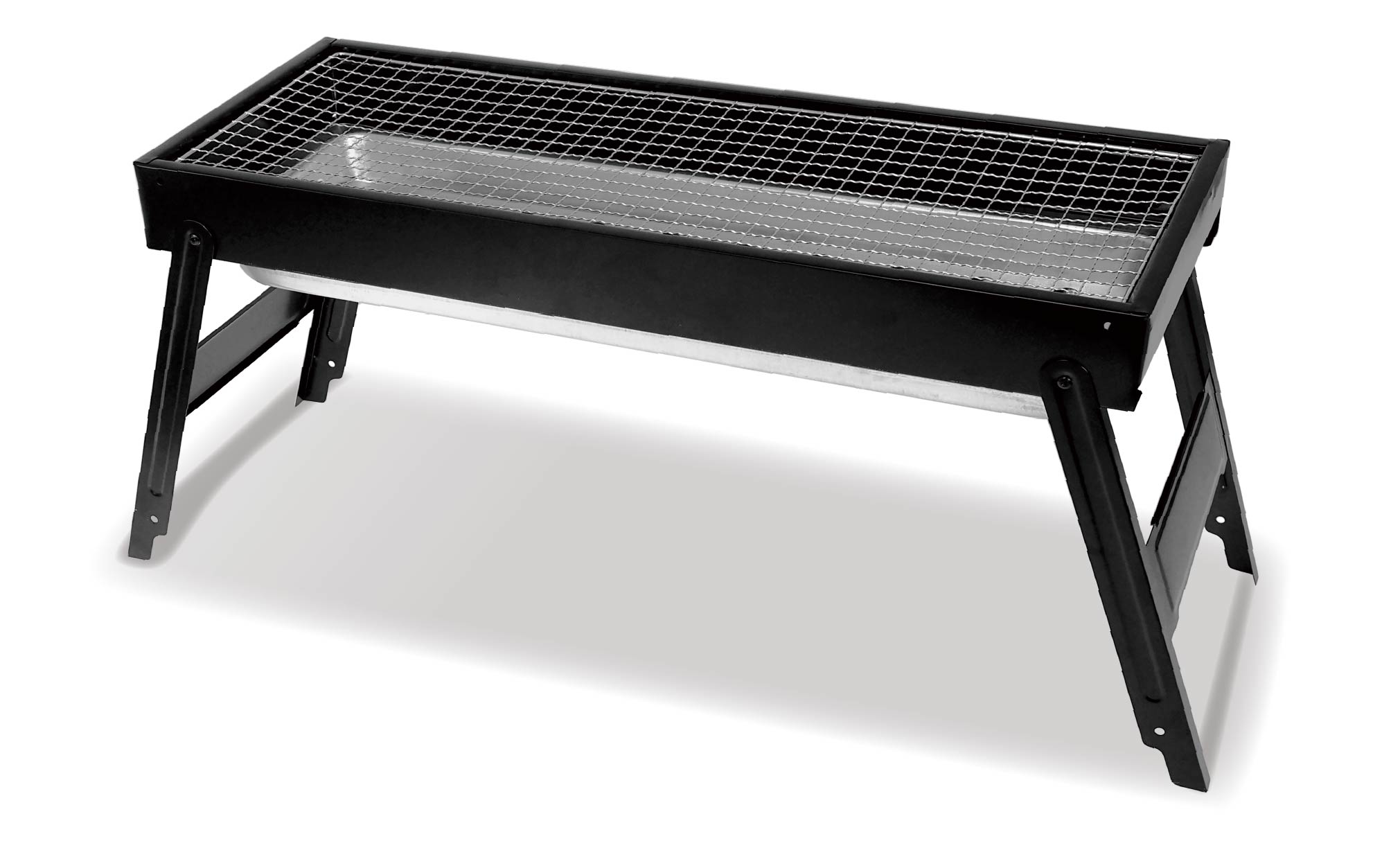 工具要らずで簡単に組み立て可能なBBQワイドコンロ。焼網面がワイドなので、焼き鳥やお肉などを並べて一気に焼き上げます。炭受け皿はスライド式で燃料の補充も簡単に。コンロの左右面には風通し穴が空いていて、燃焼効率を高めたコンロ設計です。底面プレート付きで使用後の掃除も楽々便利なアイテムです。