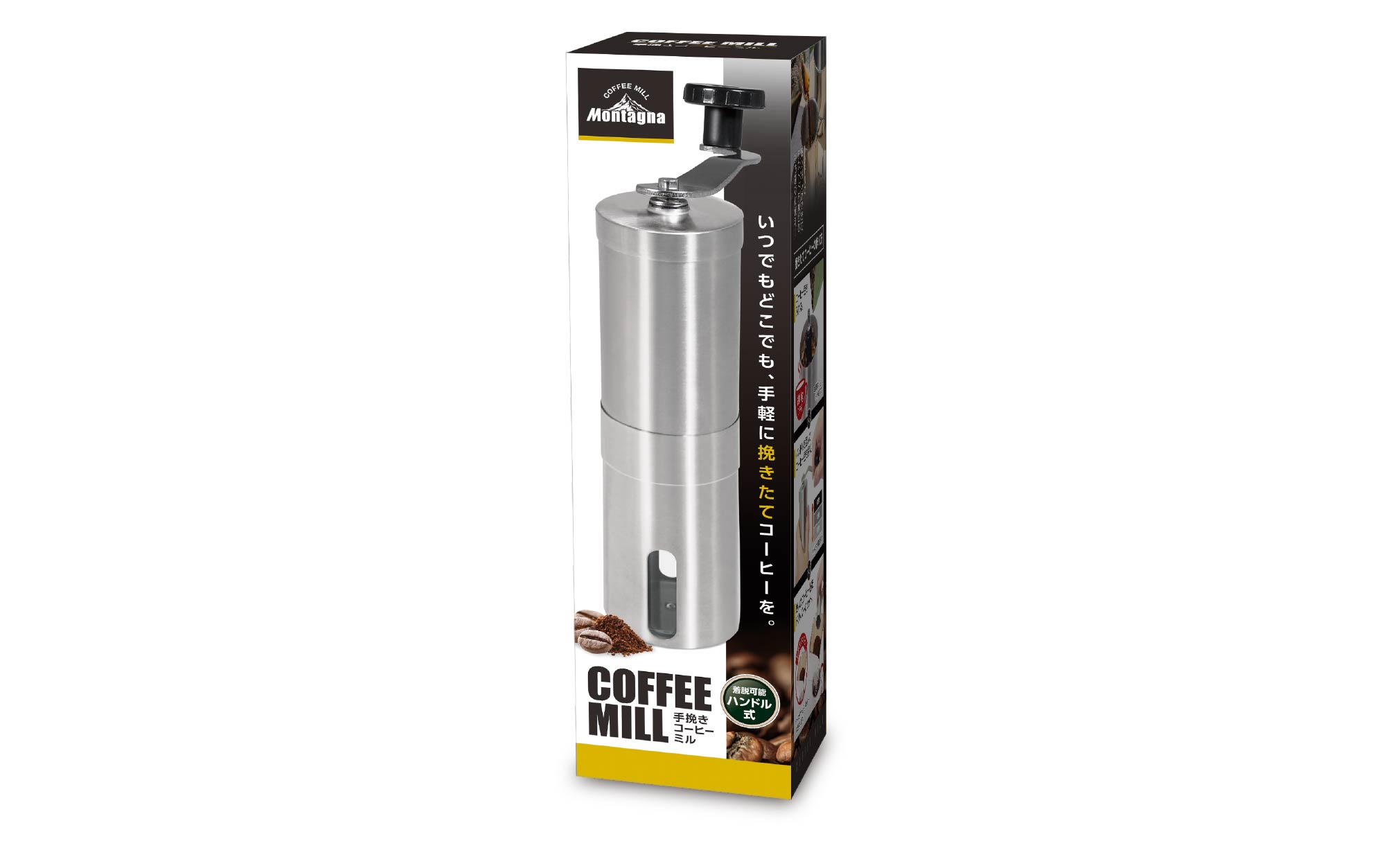 アウトドアで手軽に挽きたてコーヒーを味わえるコーヒーミル。手動式でハンドルを回すだけで簡単にコーヒー豆を挽けます。粗挽き・中挽き・細挽きと粗さ調整が可能。ハンドルとシリンダーは分解できるので持ち運びが楽々。分解して丸洗いできるので衛生的で利便性も抜群。