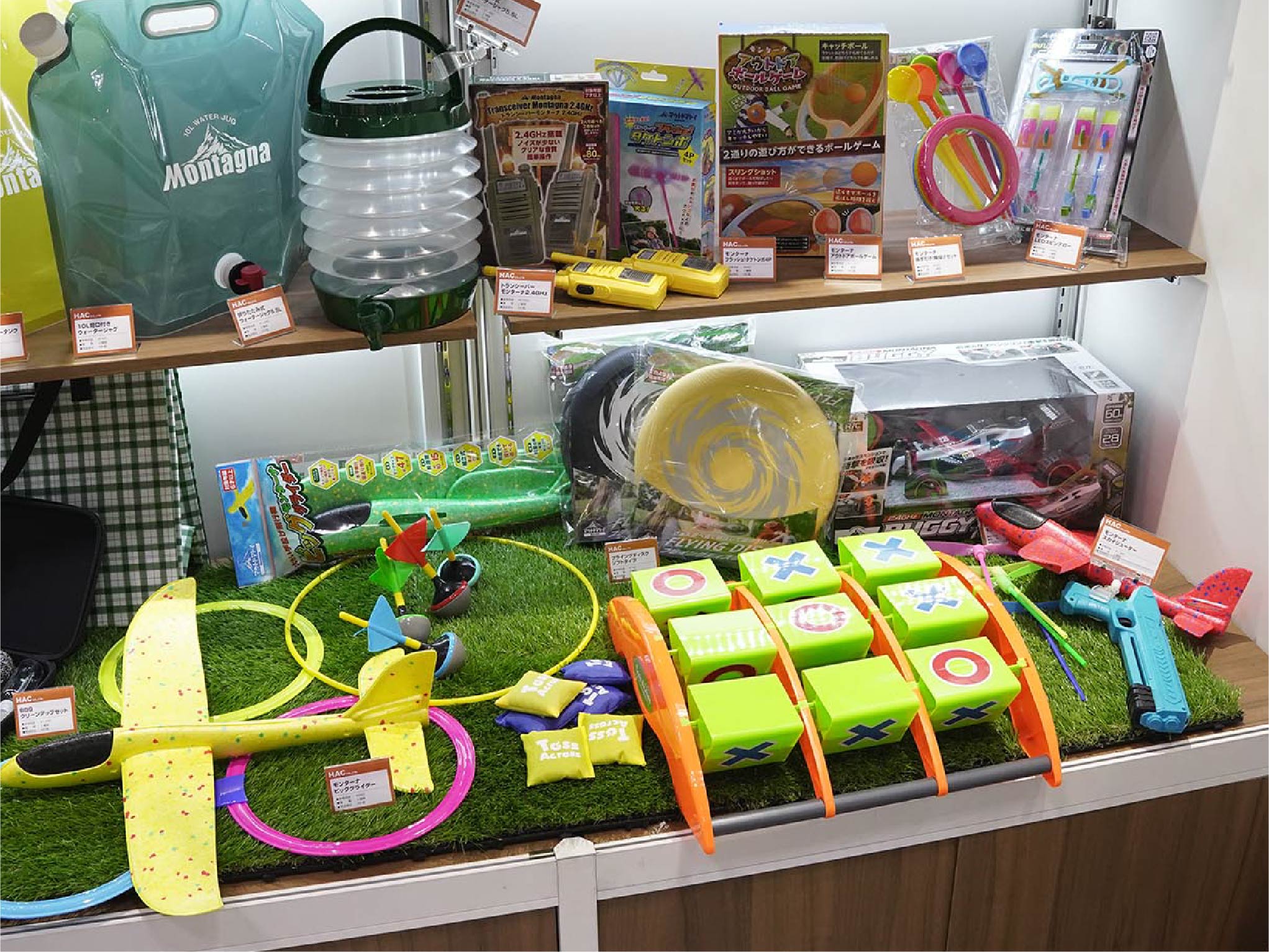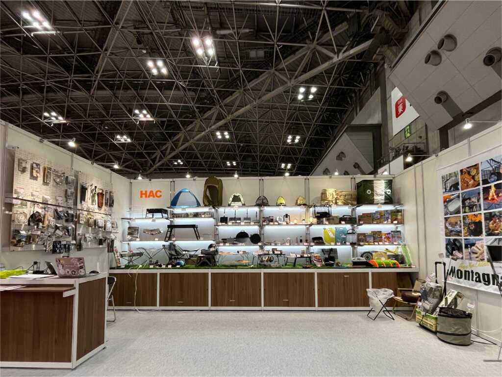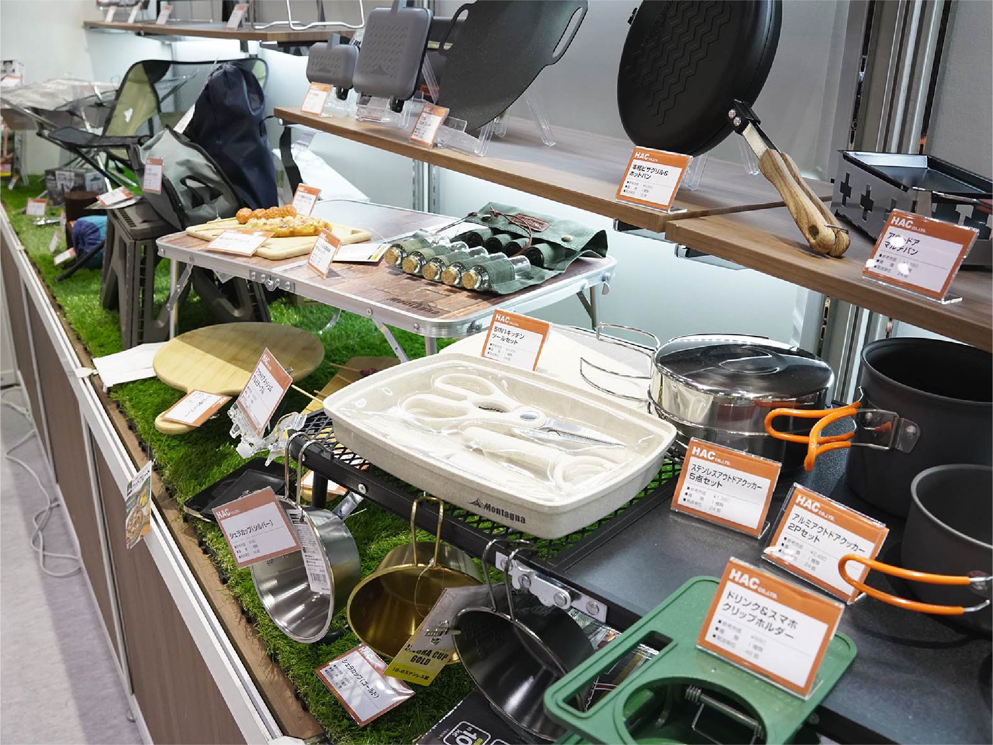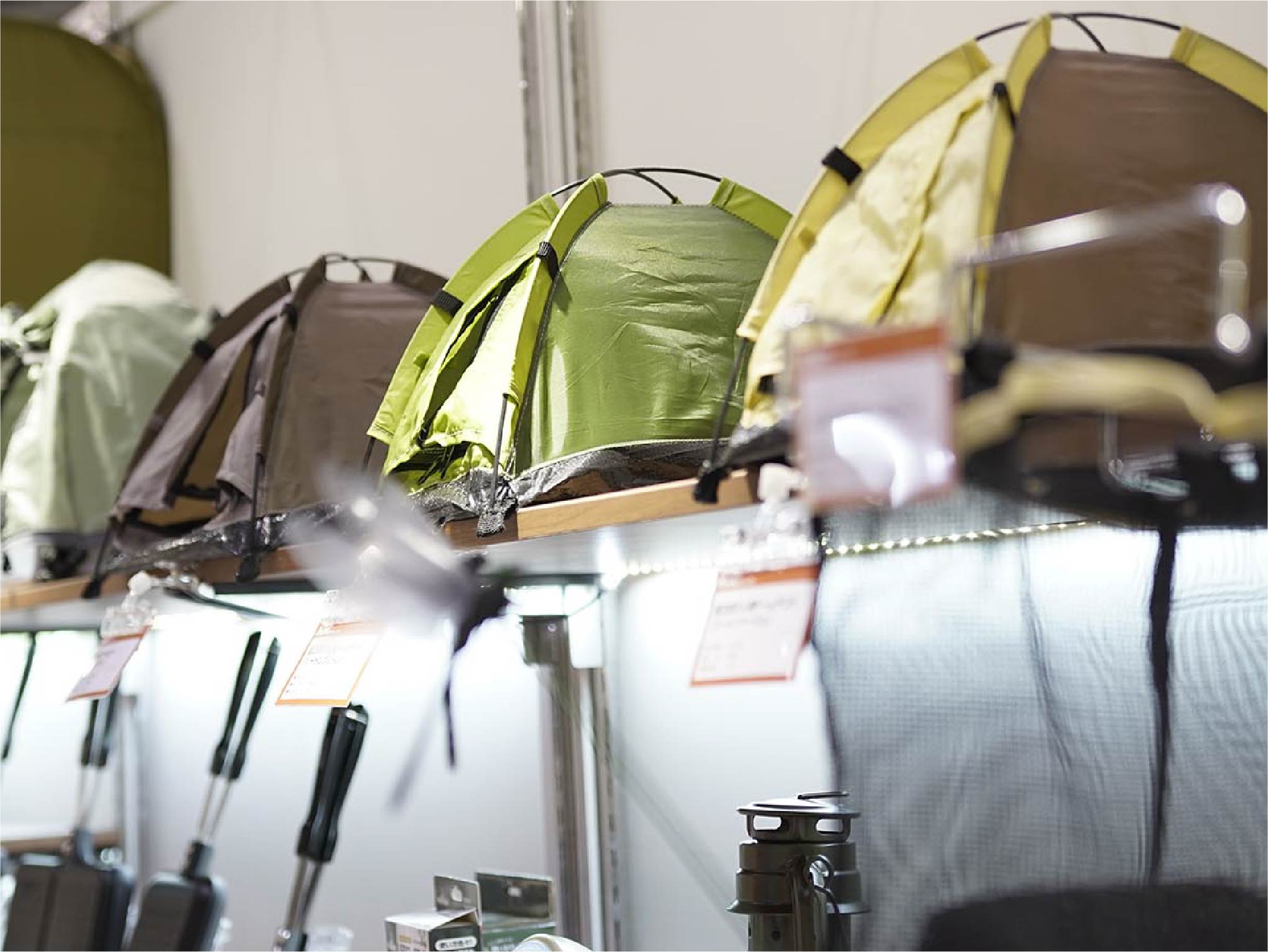 2024年新製品の展示も合わせて、オールシーズンに使用できる幅の広いアウトドアラインナップのアイテムを展示。
