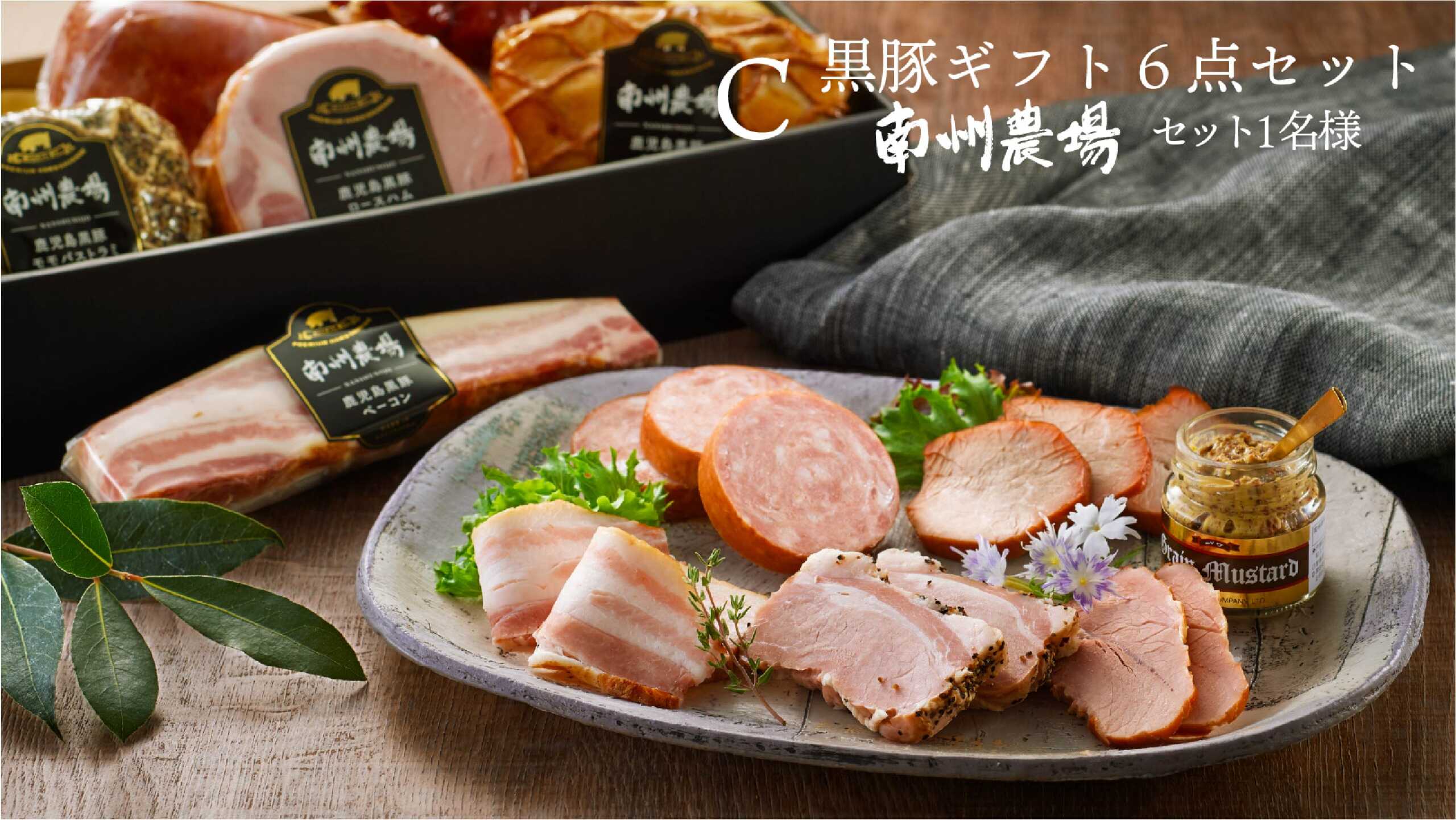 ※かごしま黒豚のみを使用した6種類の黒豚ハムセット。南州農場を代表する芳醇な香りと深い味わいの「二年熟成生ハム」に舌鼓。